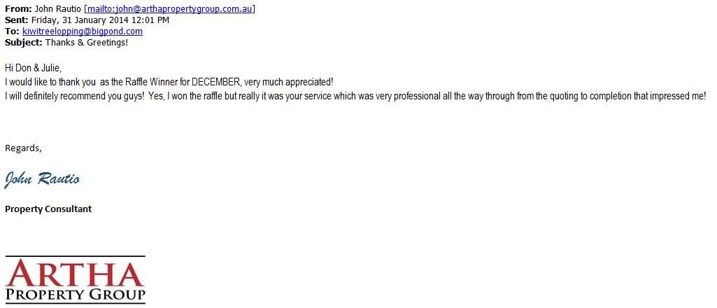 "I take this opportunity to provide you with feedback for the job done at my property on Monday. From the moment I first called your office to obtain a quote to the conclusion of the job, it has been hassle free, professional and efficient. I have obtained a few other quotes and yours was half or more than some of the other quotes. I want to thank you and your team for providing excellent service at a competitive price."
