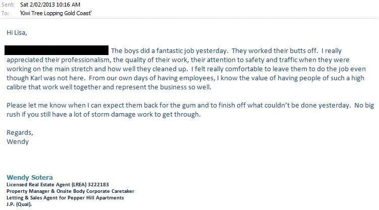 Here at Kiwi Tree Lopping, we are proud of the work we have done around the Brisbane, Gold Coast and Logan areas. But don't take our word for it.. Take a look at what some of our past clients are saying about our professional tree felling services.